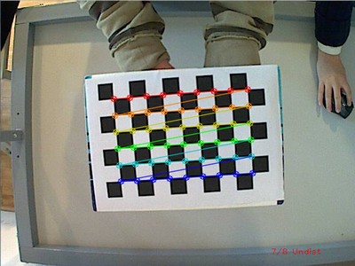 <opencv_storage> images/CameraCalibration/VID5/xx1.jpg images/CameraCalibration/VID5/xx2.jpg images/CameraCalibration/VID5/xx3.jpg images/CameraCalibration/VID5/xx4.jpg images/CameraCalibration/VID5/xx5.jpg images/CameraCalibration/VID5/xx6.jpg images/CameraCalibration/VID5/xx7.jpg images/CameraCalibration/VID5/xx8.jpg </opencv_storage> @endcode Then passed images/CameraCalibration/VID5/VID5.XML as an input in the configuration file. Here's a chessboard pattern found during the runtime of the application: